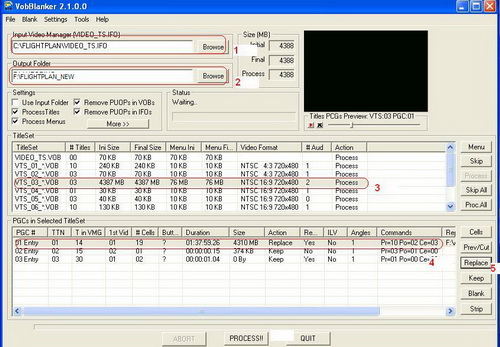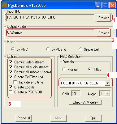 разборка (demux) основного фильма на составляющие. Грузим IFO-файл от нужной VOB-группы в PGCDemux, выбираем PGC с фильмом (здесь - это PGC 1), жмем кнопку “Process!” и дожидаемся окончания работы.